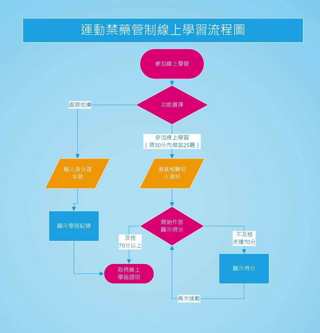 教育部體育署針對需要通過線上學習平台測驗才能報名的賽會為「113年全民運動會(目前為參加第一類競賽種類之運動員)」及「114年」起教育部體育署主辦之中等以上學校全國性運動賽會(包括全國中等學校運動會、全國大專校院運動會及各項學生運動聯賽)之參賽運動員。