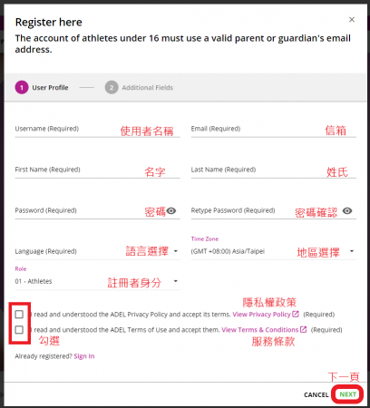 3. Complete all the fields. Select your role from the drop-down list and click on the box to accept the ADEL privacy policy and the Terms and conditions. Then click next.